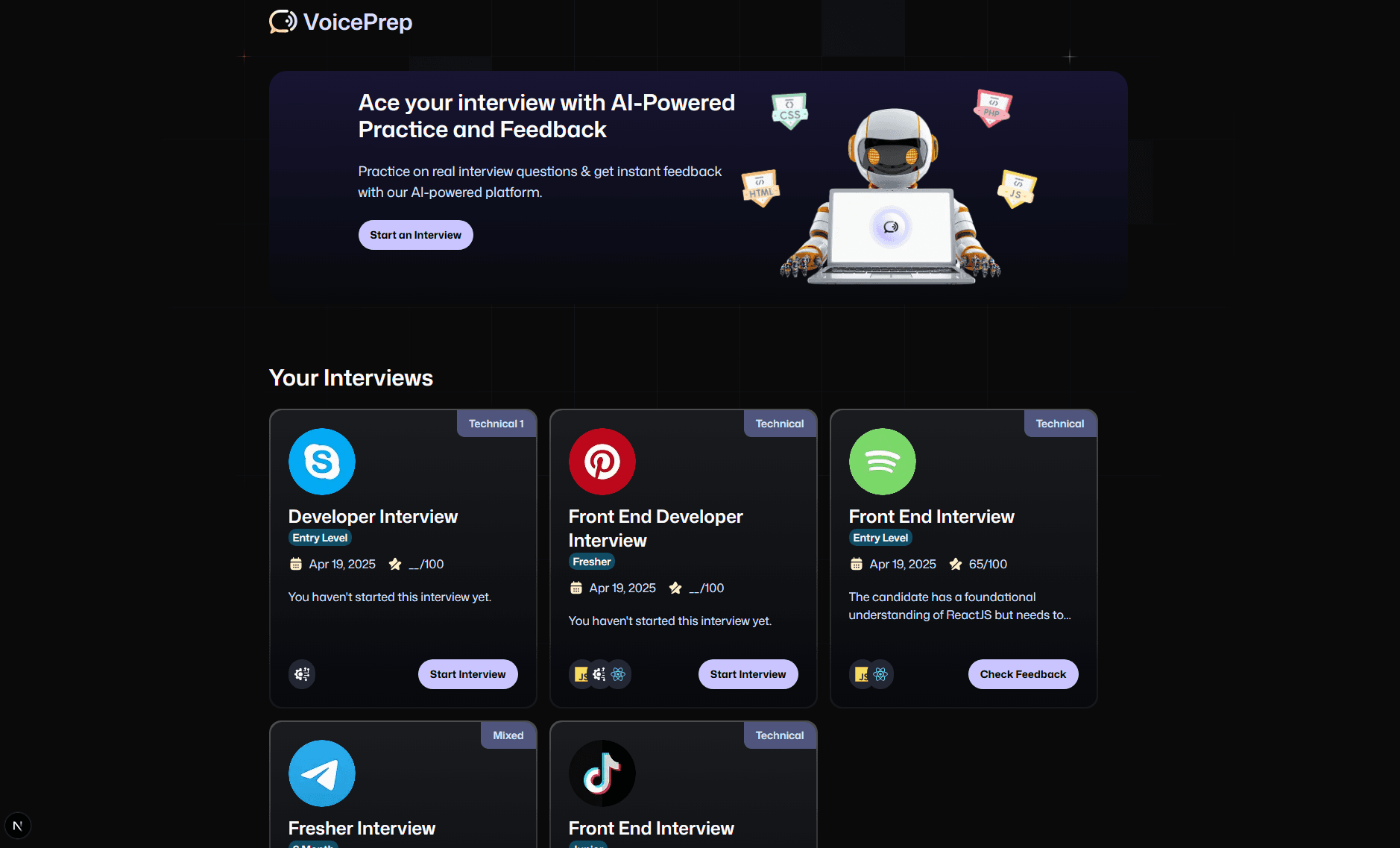 Built with Next.js for the user interface and backend logic, Firebase for authentication and data storage, styled with TailwindCSS and using Vapi's voice agents, VoicePrep AI is a website project designed to help you learn integrating AI models with your apps. The platform offers a sleek and modern experience for job interview preparation.